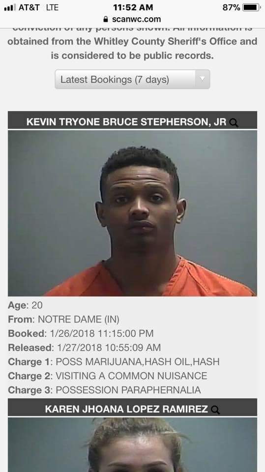 <blockquote class="twitter-tweet" data-lang="en"><p lang="en" dir="ltr">Per the Whitley County (Ind.) Sheriffs office, former Notre Dame WR Kevin Stepherson was arrested on Friday night in Whitley County.<a href="https://t.co/b4tHmgpxL0">https://t.co/b4tHmgpxL0</a></p>— Matt Freeman (@mattfreemanISD) <a href="https://twitter.com/mattfreemanISD/status/957615058359668736?ref_src=twsrc%5Etfw">January 28, 2018</a></blockquote> <script async src="https://platform.twitter.com/widgets.js" charset="utf-8"></script>
