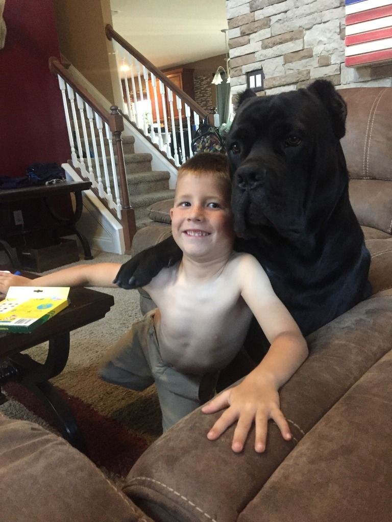 Zeus, our 133lbs, 15month old Cane Corso is coming along well. This is our first time owning this breed, but my wife and I have discussed that we are probably own at least one of these for the rest of our dog owning days. Absolutely great dog, amazing with the neighborhood dogs and kids. As you can see, my son and him are best buds.