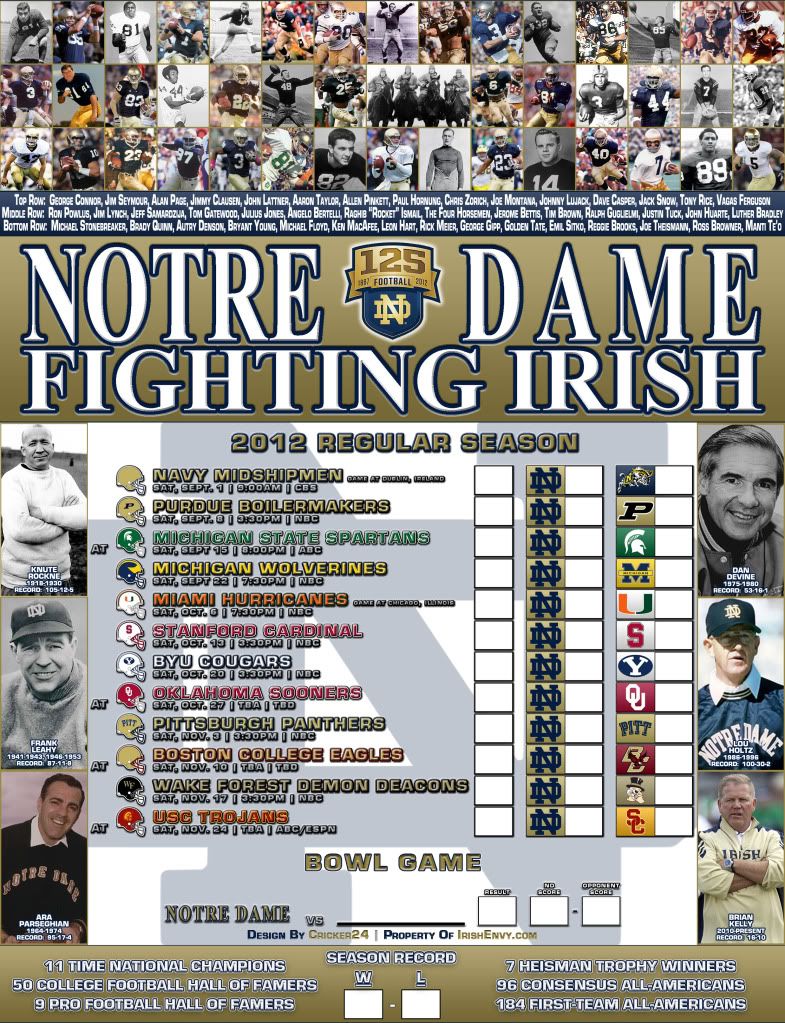 Here's a printable 2012 Notre Dame football schedule I made. I highly recommend printing it on photo paper. It just makes it look nicer. I try to make the design a little different every year. This year I made the design to honor the 125th season of ND football. You may recall the thread I started a few weeks ago about what legendary ND players to include in my design. I appreciated everyone's suggestions and I did my best to include as many players as I could in the design, but I only had so much room to work with and as we all know, Notre Dame has had TONS of great players over the last 125 years. Obviously not everyone is going to agree with all of the players I picked, but hopefully you agree with most of my choices. So, please enjoy and let me know what you think. I welcome any and all feedback.